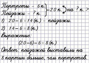 7. В зале музея выставили 20 картин, из них 6 портретов, остальные - пейзажи. На сколько больше выставили пейзажей, чем портретов?
