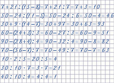 | 7 + 21 : (15 - 8) = 7 + 21 : 7 = 7 + 3 = 10 | 60 - (24 + 3) : 3 = 60 - 27 : 3 = 60 - 9 = 51 |