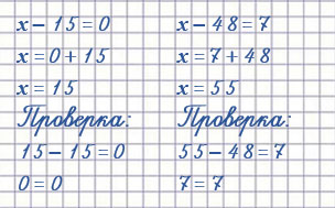 | х : 7 = 6 х = 6 • 7 х = 42 | 72 - х = 7 х = 72 - 7 х = 65 | х - 48 = 7 х = 7 + 48 х = 55 |
