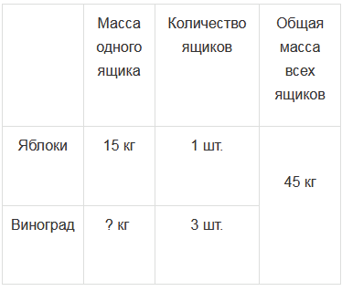 13. Масса ящика с яблоками и трёх одинаковых ящиков с виноградом равна 45 кг. Чему равна масса ящика с виноградом, если масса ящика с яблоками равна 15 кг?