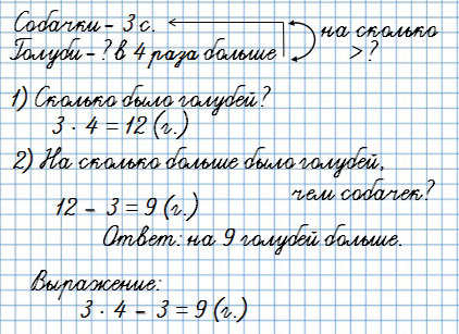17. В цирковом представлении участвовали 3 собачки, а голубей было в 4 раза больше. На сколько больше было голубей, чем собачек?