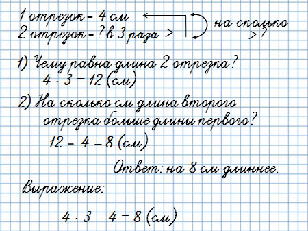 22. Начерти два отрезка так, чтобы длина одного была 4 см, а длина другого - в 3 раза больше. Обозначь отрезки буквами и узнай, на сколько сантиметров один из них короче другого.