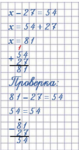 х - 27 = 54 - неизвестное уменьшаемое (находим сложением: нужно к разности прибавить вычитаемое)