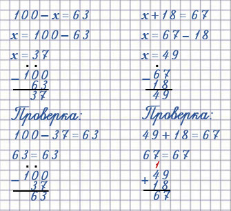 100 - х = 63 - неизвестное вычитаемое (находим вычитанием: нужно из уменьшаемое вычесть разность)