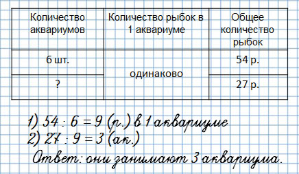 3. В зоомагазине в 6 аквариумах 54 рыбки, поровну в каждом. Сколько аквариумов занимают 27 рыбок?