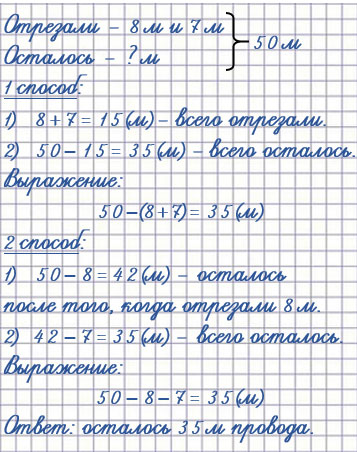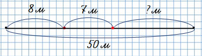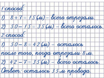 5. Длина провода 50 м. Сначала от него отрезали 8 м, потом 7 м. Сколько метров провода осталось?