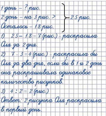 Ответ: в первый день Оля раскрасила 2 рисунка.