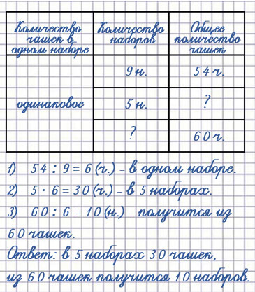 2. В 9 одинаковых наборах 54 чашки. Сколько чашек в 5 таких наборах? Сколько таких наборов получится из 60 чашек?