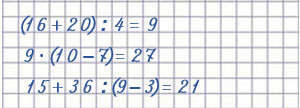 (16 + 20) : 4 = 9 9 • (10 - 7) = 27