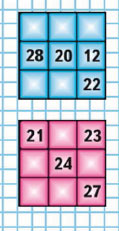 Сложи числа в каждом квадрате по строкам, по столбцам, из угла в угол. Если суммы равны, то такой квадрат называется магическим.