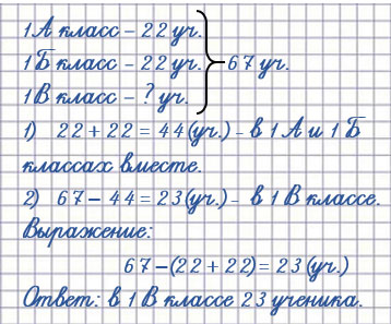 26. В первый класс школы в этом году поступили 67 человек. Их распределили по классам так: в 1 А - 22 ученика, в 1 Б - столько же, в 1 В - остальных детей. Сколько учеников в 1 В классе?