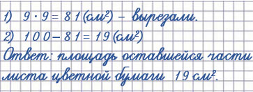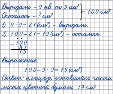 30. Площадь листа цветной бумаги 100 см². Из него вырезали 9 квадратов, площадью по 9 см² каждый. Найди площадь оставшейся части листа цветной бумаги.