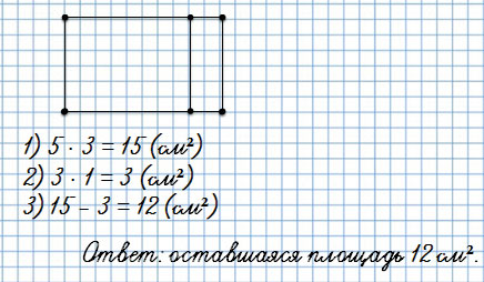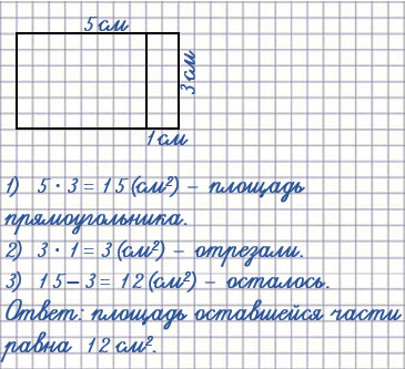 От прямоугольника, длины которого 5 см и 3 см, отрезали полоску со сторонами 3 см и 1 см. Найди площадь оставшейся части.