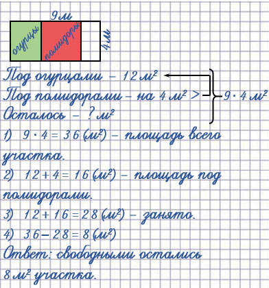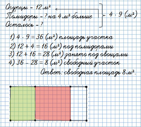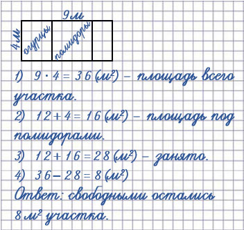 32. Начерти план участка прямоугольной формы со сторонами 4 м и 9 м, изображая 1 м² одной клеткой. Покажи на плане, что огурцами занято 12 м², а помидорами - на 4 м² больше, чем огурцами. Сколько квадратных метров участка остались свободными?
