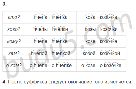 3. Измените по вопросам кто? кого? кому? кем? о ком? существительные пчела - пчёлка, коза - козочка. Запишите их. Безударные окончания проверяйте ударными.