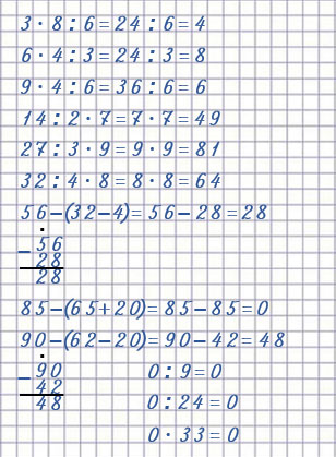 | 56 - (32 - 4) = 56 – 28 = 28 | 0 : 9 = 0 |
