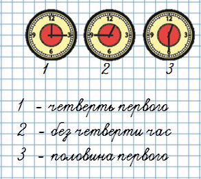 3. Назови время, которое показывают часы, используя слова "четверть" и "половина".