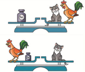 На первом рисунке на весах 5 кг равно массе кошки + масса петуха.