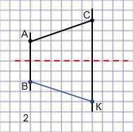 2) По алгоритму, приведенному в первом пункте строим точки В и К, симметричные точкам А и С соответственно относительно оси симметрии, проведенной красным. Затем соединяем точки В и К и получаем отрезок ВК, симметричный отрезку АС, относительно оси симметрии, проведенной красным.