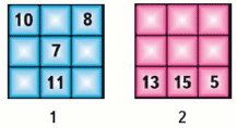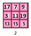 3. Оставляя на местах числа 13, 15 и 5 в квадрате 2, расставь в его пустые клетки числа 3, 7, 9, 11, 17, 19 так, чтобы получить магический квадрат.