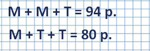 5. Два одинаковых пакета молока и пачка творога стоят 94 р. Две такие же пачки творога и один такой же пакет молока стоят 80 р. На сколько рублей один пакет молока дороже одной пачки творога?