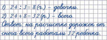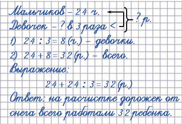 2. Ребята расчищали от снега дорожки около шко­лы. Мальчиков было 24, а девочек — в 3 раза меньше. Сколько всего ребят работало на рас­чистке дорожек от снега?