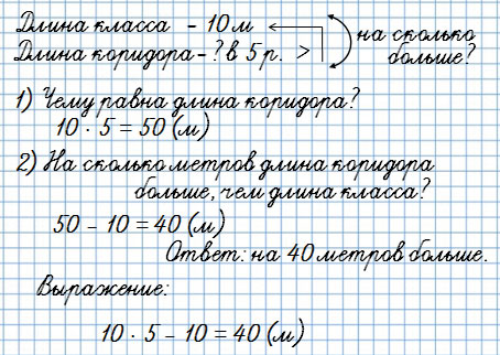 3. Длина класса  м, а длина коридора в 5 раз больше длины класса. Дополни условие и узнай длину коридора.