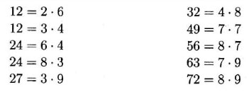 7. При умножении каких двух однозначных чисел может получиться 12; 24: 27; 32; 49; 56; 63; 72?