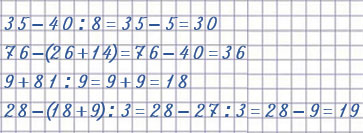 | 76 - (26 + 14) = 76 - 40 = 36 | 28 - (18 + 9) : 3 = 28 - 27 : 3 = 28 - 9 = 19 |
