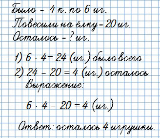 4. Для украшения ёлки приготовили 4 коробки с ёлочными игрушками, по 6 игрушек в каждой коробке. Из них на ёлку повесили 20 игрушек. Сколько игрушек осталось в коробках?