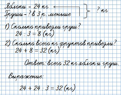 5. В школьную столовую привезли 24 кг яблок, а груш в 3 раза меньше. Сколько всего килограммов яблок и груш привезли в школьную столовую?