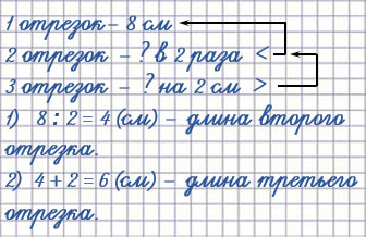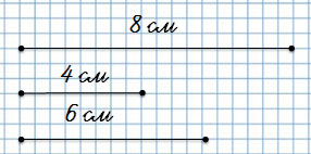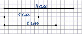6. Начерти три отрезка: длина первого отрезка 8 см, второго — в 2 раза меньше первого, а длина третьего — на 2 см больше второго.