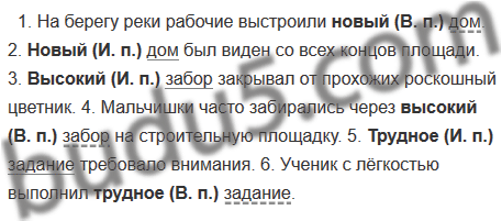 1. На берегу реки рабочие выстроили новый дом. 2. Новый дом был виден со всех концов площади. 3. Высокий забор закрывал от прохожих роскошный цветник. 4. Мальчишки часто забирались через высокий забор на строительную площадку. 5. Трудное задание требовало внимания. 6. Ученик с лёгкостью выполнил трудное задание.