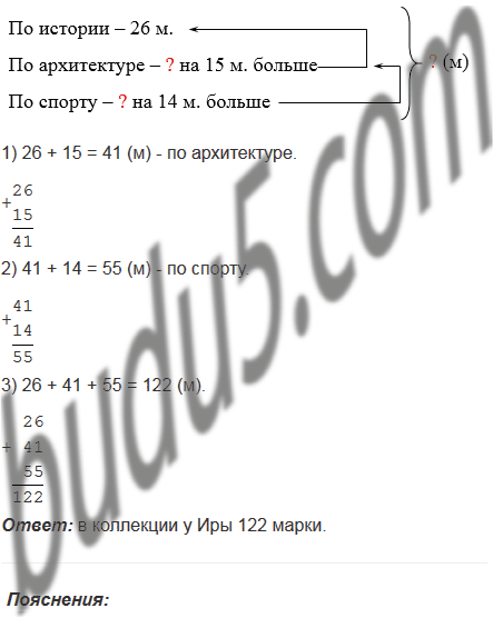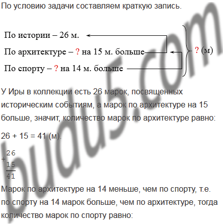 У Иры в коллекции есть 26 марок, посвященных историческим событиям, а также марки, посвященные архитектуре и спорту. Марок по архитектуре у нее на 15 больше, чем по истории, и на 14 меньше, чем на спортивную тему. Сколько марок в коллекции у Иры?