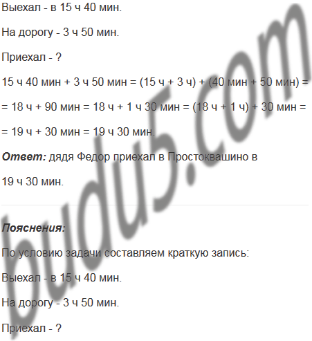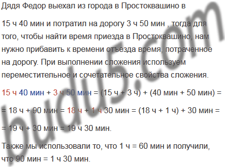 Дядя Федор выехал из города в Простоквашино в 15 ч 40 мин и потратил на дорогу 3 ч 50 мин. В котором часу дядя Федор приехал в Простоквашино?
