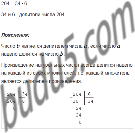 Число 204 равно произведению чисел 34 и 6. Является ли число 34 делителем числа 204? А число 6?