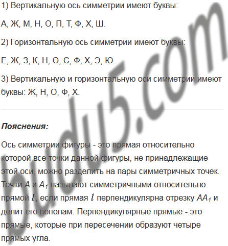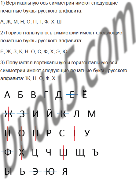 Какие печатные буквы русского алфавита имеют: 1) вертикальную ось симметрии; 2) горизонтальную ось симметрии; 3) вертикальную и горизонтальную оси симметрии?