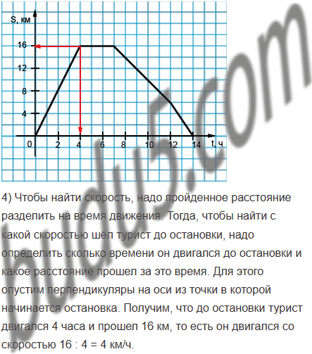 4) С какой скоростью шёл турист до остановки?