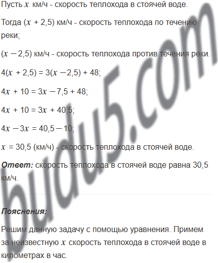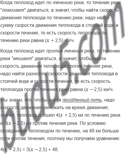 Теплоход прошёл 4 ч по течению реки и 3 ч против течения. Путь, пройденный теплоходом по течению, на 48 км больше пути против течения. Найдите скорость теплохода в стоячей воде, если скорость течения равна 2,5 км/ч.