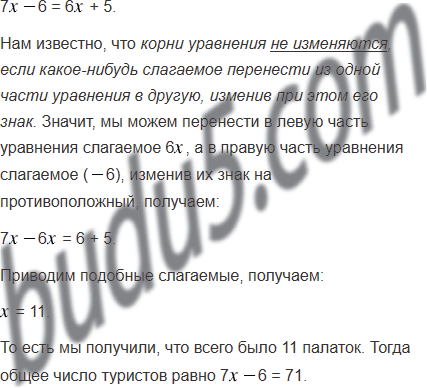 При расселении туристов в палатки оказалось, что если в каждую палатку поселить 6 туристов, то 5 туристам места не хватит, а если расселять по 7 туристов, то 6 мест останутся свободными. Сколько туристов поселили в палатке?
