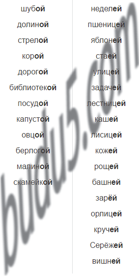 Шуба, долина, неделя, пшеница, стрела, кора, яблоня, стая, дорога, улица, библиотека, задача, лестница, посуда, каша, капуста, овца, лисица, кожа, роща, башня, берлога, малина, скамейка, заря, орлица, круча, Серёжа, вишня.