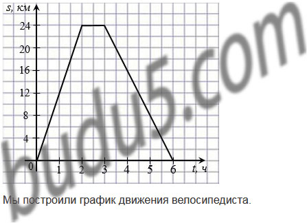 Велосипедист выехал из дома на прогулку. Сначала он ехал 2 ч со скоростью 12 км/ч, потом отдохнул час и вернулся домой со скоростью 8 км/ч. Постройте график движения велосипедиста.