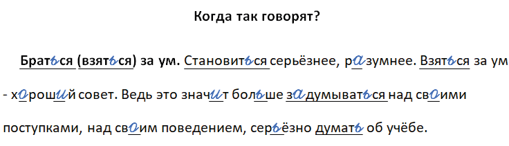 Брат_ся (взят_ся) за ум. Становит_ся серьёзнее, р_зумнее. Взят_ся за ум - х_рош_й совет. Ведь это знач_т бол_ше з_думыват_ся над св_ими поступками, над св_им поведением, сер_ёзно думат_ об учёбе.