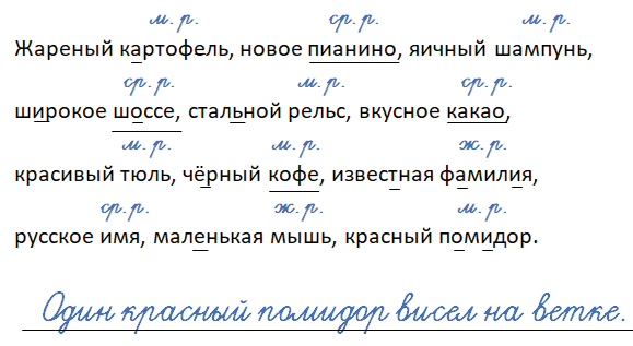 Жареный картофель (м. р.), новое пианино (ср. р.), яичный шампунь (м. р.), широкое шоссе (ср. р.), стальной рельс (м. р.), вкусное какао (ср. р.), красивый тюль (м. р.), черный кофе (м. р.), известная фамилия (ж. р.), русское имя (ср. р.), маленькая мышь (ж. р.), красный помидор (м. р.).