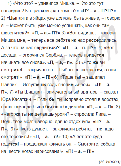1) Что это уд..вился Мишка Кто это тут навр..дил Кто раск..вырял землю 2) Ц..плята в яйцах уже должны быть живые говорю я Может быть уже можно услышать как они там ш..велят(?)ся 3) Вот вид..шь говорит Мишка мне теперь все р..бята на нас ра(с, сс)..рдились А за что на нас с..рдит(?)ся 4) Вот досада ог..рчился Серёжа теперь пр..дёт(?)ся начинать всё снов.. 5) Что(же) вы смотр..те закр..чал он Пчёлы разл..тают(?)ся а они смотр..т 6) Тише ты заш..пел Павлик Испуга..ш.. ведь пчели(н, нн)ый рой 7) Ты Шишкин замечательный вр..тарь сказал Юра Касаткин Если(бы) ты и(с, з)правно стоял в воротах, наша к..манда была(бы) (не)победимой 8) Чего(же) ты (не)делаеш.. уроки спр..сила Лика Ведь твой мозг наверно давно отдохнул 9) Пусть дума..т закр..чали р..бята (не)надо его торопить 10) А вот это куда годит(?)ся продолжал кр..чать он Смотрите с..бака на шести ногах нарисова(н, нн)а