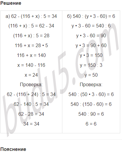 | а) 62 - (116 + х) : 5 = 34 | б) 540 : (у • 3 - 60) = 6 |