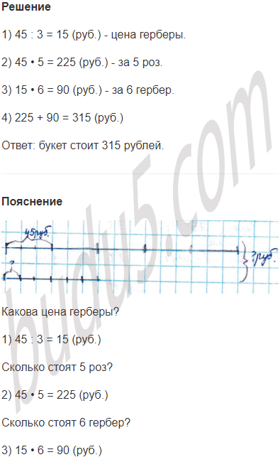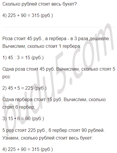 Задание № 4. Для букета купили 5 роз и 6 гербер. Каждая роза стоит 45 руб., а гербера - в 3 раза дешевле. Сколько рублей стоит весь букет?