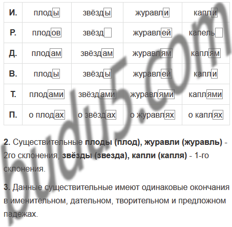 1. Просклоняйте письменно существительные плоды, звёзды, журавли, капли.