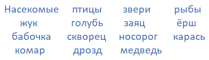 Дополним каждую группу новыми словами. Насекомые: пчела, кузнечик, мотылёк. Птицы: аист, орёл, ласточка. Звери: жираф, кабан, олень. Рыбы: судак, щука, карп.