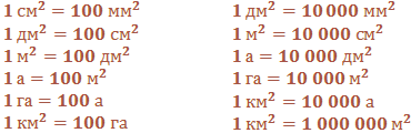 Для измерения площадей используют такие единицы измерения: